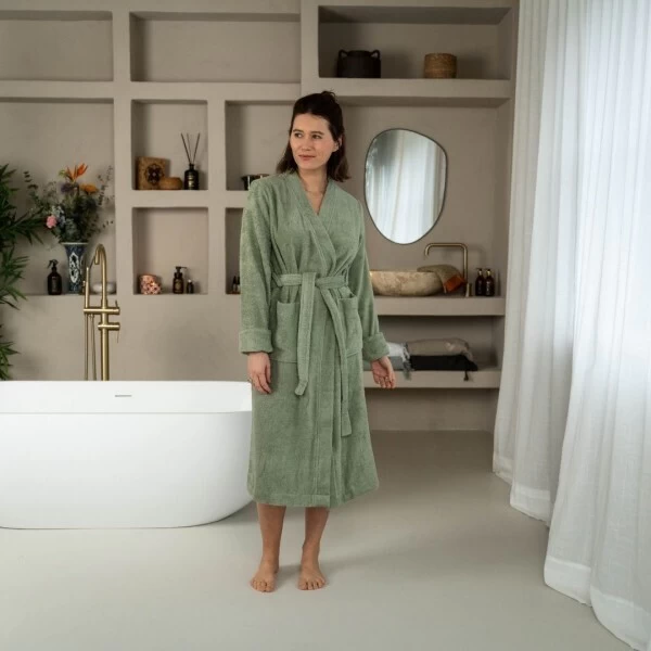 Wikkel jezelf in een heerlijke zachte badjas: de unisex badjas olijfgroen is gemaakt voor comfort. De mouw heeft een elegante omslag waarmee je de lengte kunt aanpassen naar jouw wensen. Ook is het model net wat langer wat zorgt voor extra comfort in elke situatie.
