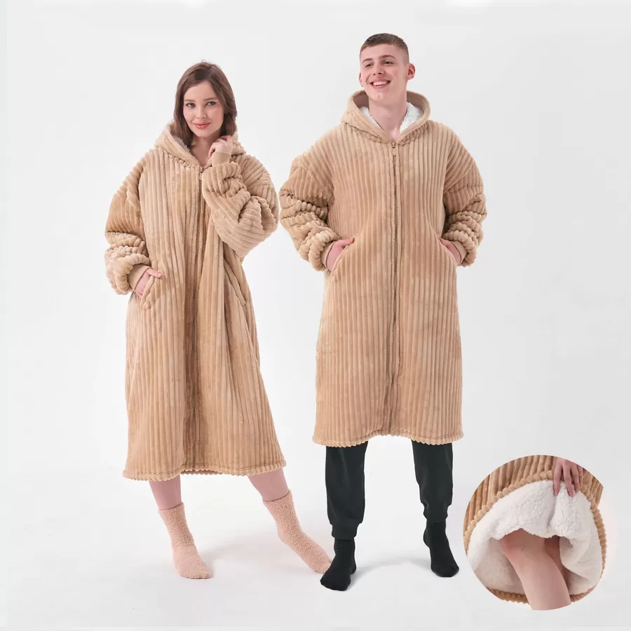 De Home Hoodie in beige met rits is gemaakt van superzachte kabelstof en heeft een extra lange, comfortabele pasvorm (one size). Dankzij de handige rits trek je hem eenvoudig aan en uit – ideaal voor cozy self-care momenten of relaxte dagen thuis.