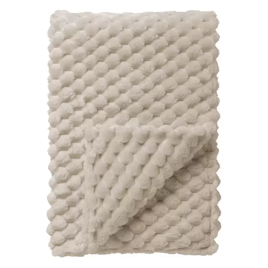 Deze royale plaid in beige van 150x200 cm is gemaakt van 100% gerecycled polyester en heeft een luxe pluche structuur. Ideaal voor een knusse avond op de bank of als stijlvol interieuraccent.