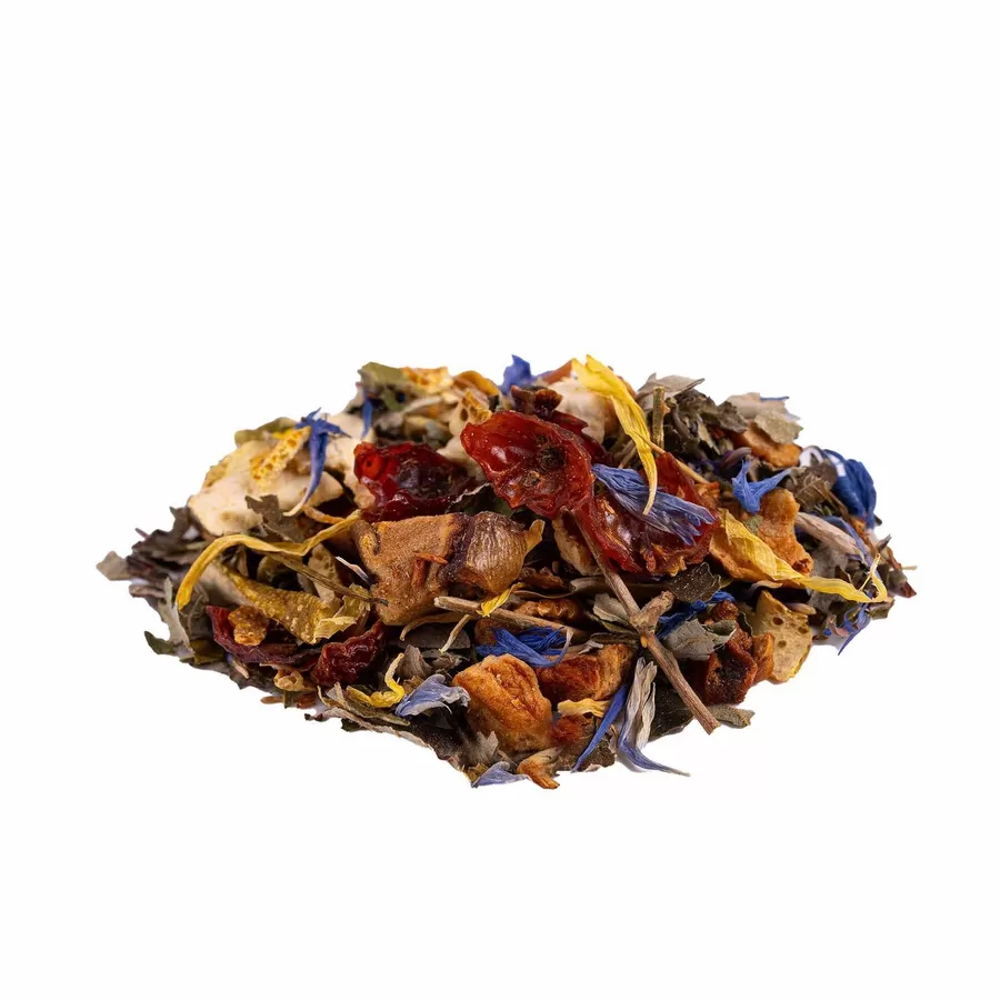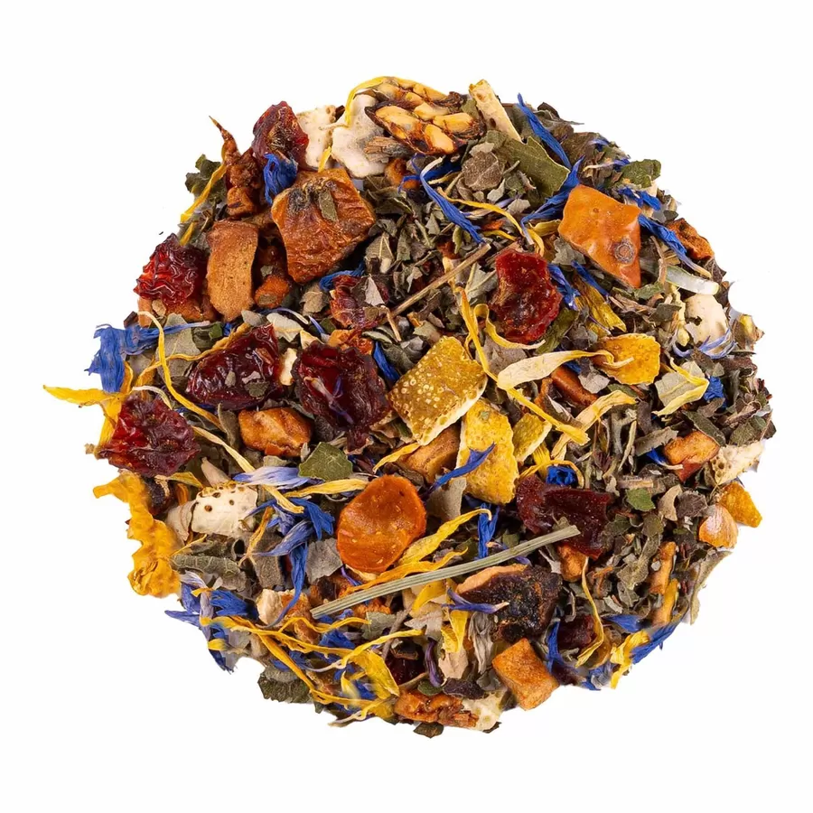 Ingredients: Apple, orange peels, rose hip, rooibos Super Grade, blackberry leaves, orange slices, blue cornflower, marigold.