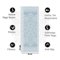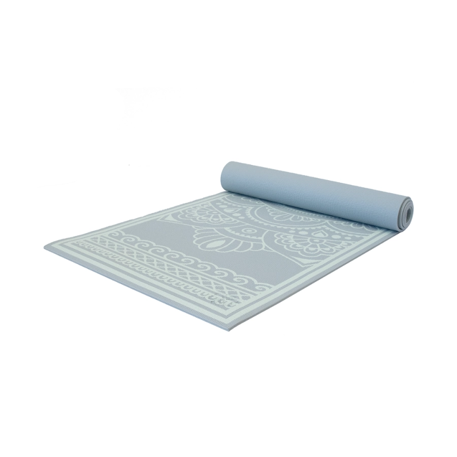 Deze Classic licht blauwe yogamat is voorzien van een schitterende geometrische print. Het design is geïnspireerd op Mehndi patronen van henna, die je ziet op de handen van Indiase bruiden. Deze print geeft je een gelijk een focuspunt, die je kan helpen tijdens je balansoefeningen. Laat deze mat jou inspireren om elke yoga pratice te zien als een nieuw begin evenals de symboliek achter de patronen van Mehndi.