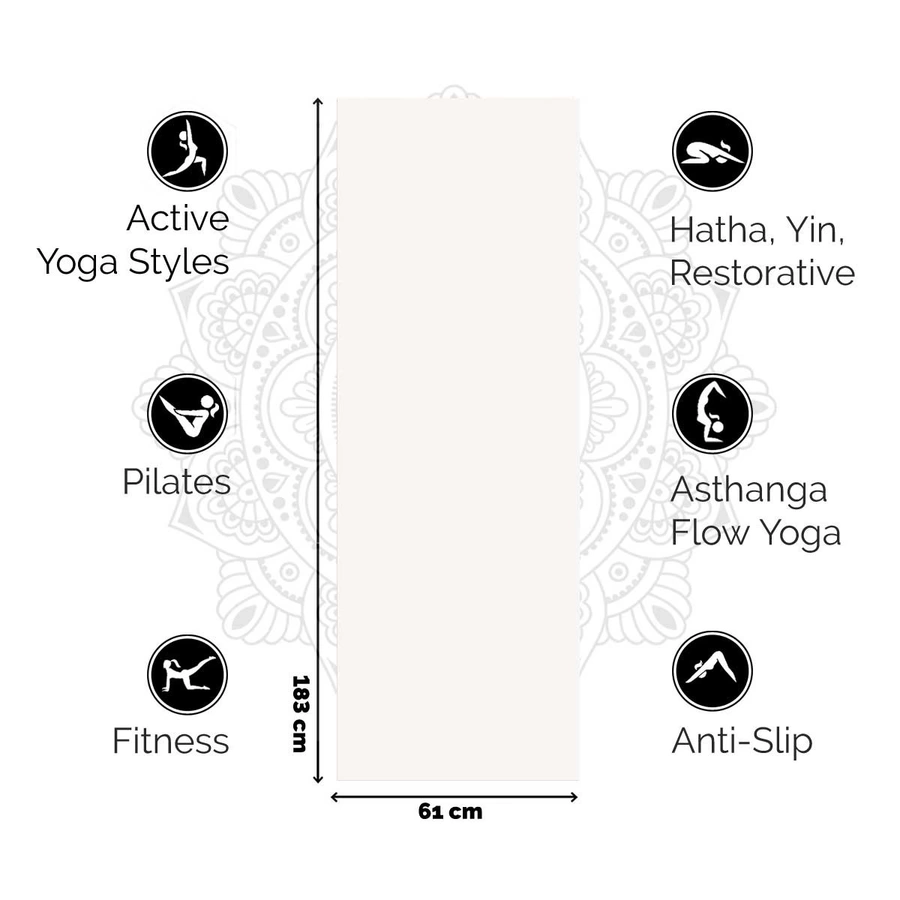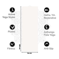 Off-white creme yogamat van 6mm. Het slijtvaste materiaal geeft je grip, stabiliteit en nét een beetje meer comfort. Daarnaast is de mat extra dik voor meer comfort bij Yoga en Pilates. Vooral geschikt voor rustige yogastijlen. Het slijtvaste materiaal voelt zacht aan en is antislip. Voorkom koude voeten en stijve spieren en sta prettig in elke houding.