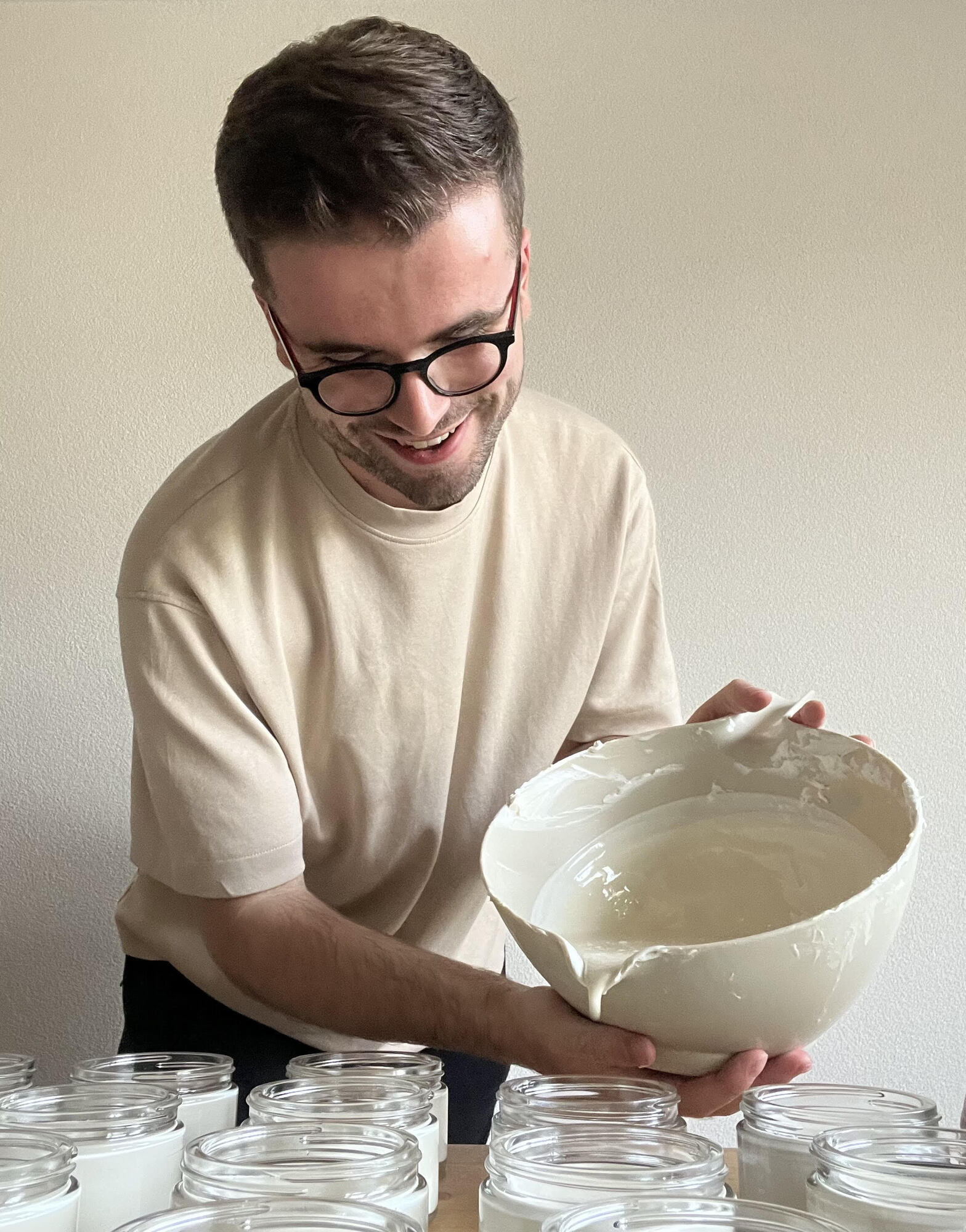 We mengen alle formules met de hand. Geur, textuur en gevoel worden continu getest, verfijnd en opnieuw beoordeeld. Dit is een intuïtief proces waarin we blijven luisteren naar wat het product nodig heeft om in balans te komen.